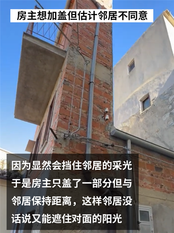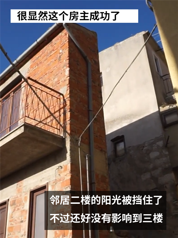 于是出于报复,他还是盖楼了,而且为了让邻居没话说,特意与邻居隔开了距离,这样对方就管不着自己,同时也遮挡了邻居的视线,但缺点就是这层楼薄得离谱了。