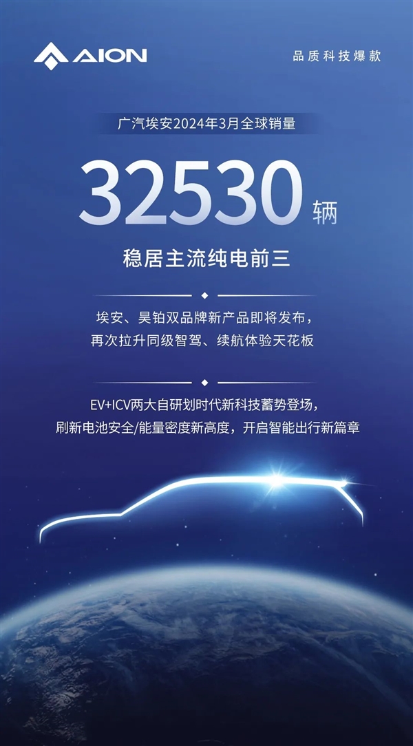 广汽埃安3月狂卖32530辆:近乎翻倍 稳居主流纯电前三