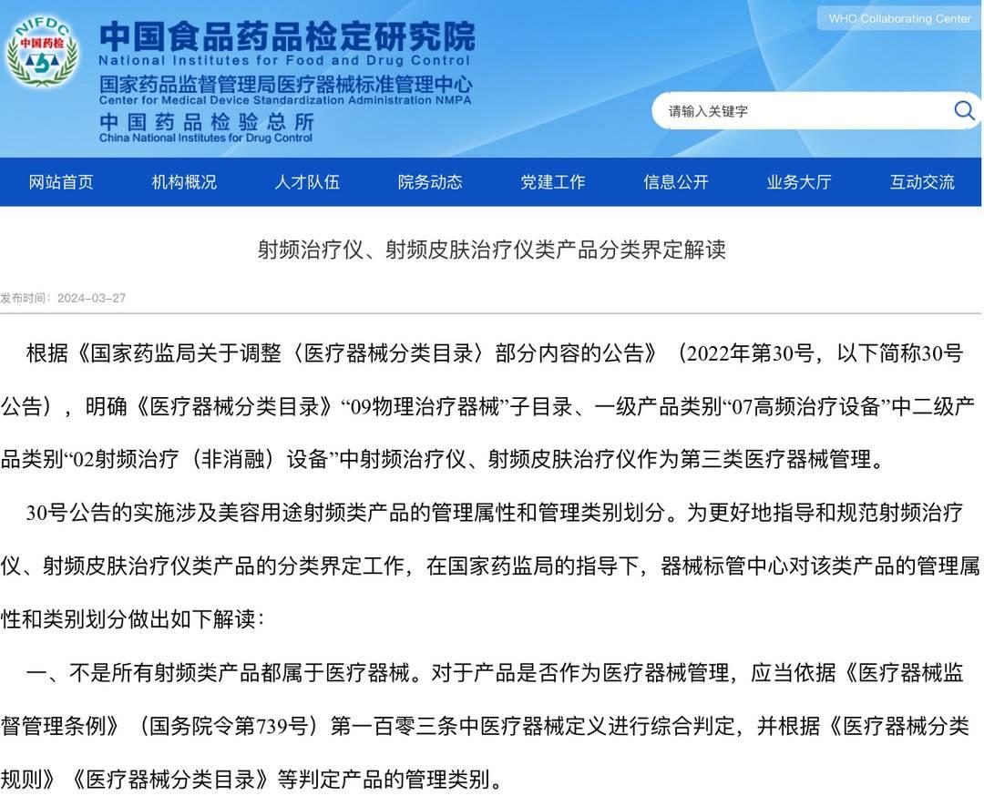 在新规正式实施之前,3月27日,国家药监局发布的相关解读似乎对于“射频美容仪”的界定有了新的要求。