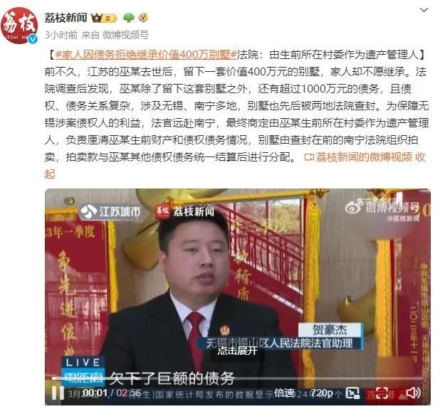 前不久,江苏的巫某去世后,留下一套价值400万元的别墅,家人却不愿继承。