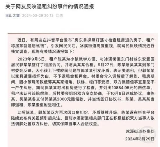 3月29日,东门村所属冰溪街道办事处也发布通告,证实双方经村委会组织多次协商,于2023年10月8日达成协议,由小陈和另一名租客各支付房东郭某某2000元赔偿款。此后双方再次因口角纠纷,矛盾继续升级,陈某遂在抖音平台陆续发布有关视频引起关注。目前,冰溪街道相关部门正在积极组织双方当事人依法调解,处置双方纠纷。
