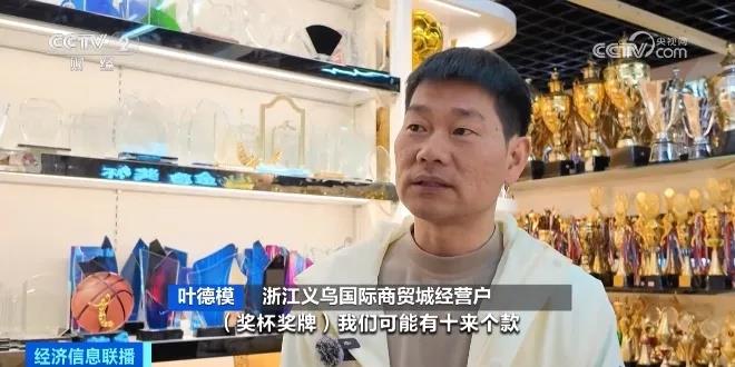 浙江义乌国际商贸城经营户 叶德模:针对欧洲的一些国家,我们可能有十几款奖杯奖牌。年初到现在,一共卖了二三十万个。