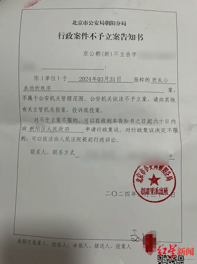 处理完伤口后,刘女士来到新源里派出所希望警方介入处理此事,不过派出所民警向刘女士出示了一份行政案件不予立案告知书,上面显示刘女士以“扰乱公共场所秩序”为由的报警不属于公安机关管辖范围,公安机关依法不予立案。