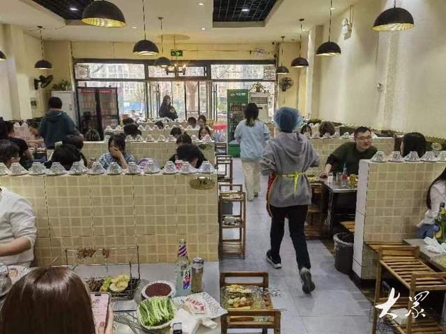 在紧邻山东理工大学的某购物广场旁,短短200米距离内就有五家烧烤店。3月31日下午4点,一家叫“每天思烤”的烧烤店里仍坐着20多位年轻人,热火朝天地吃着烤串聊着天。老板吕震告诉记者,这些年轻人是来参加公司聚餐的,从中午一直吃到了现在。