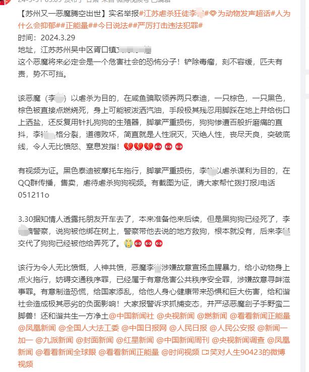 近日,苏州吴中,网传一名叫李某的人以虐杀为目的,在闲鱼平台骗取领养两只泰迪并虐杀。