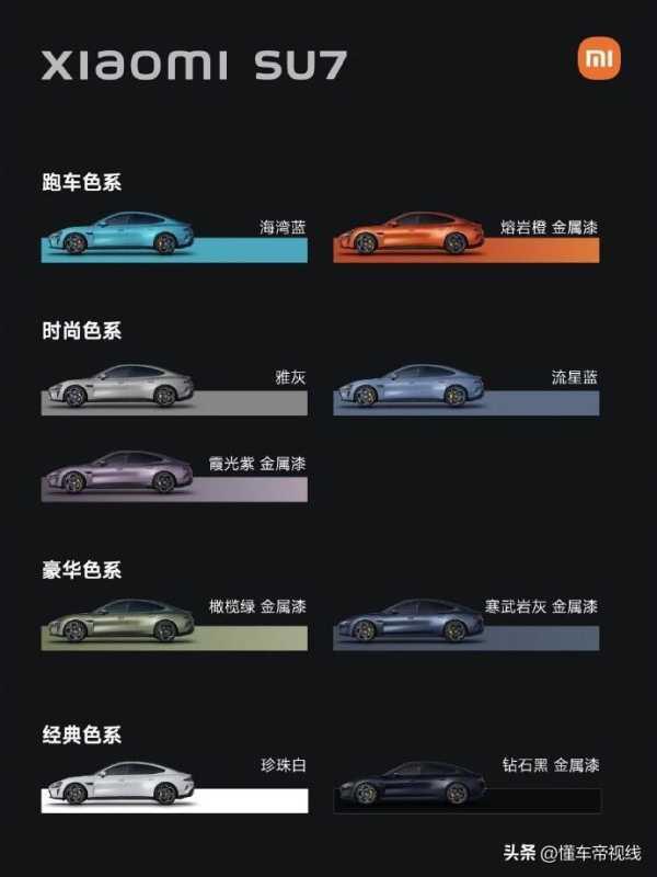 小米SU7目前有9种车漆颜色,分为四个色系。其中海湾蓝、橄榄绿、雅灰分别属于跑车色系、豪华色系、时尚色系。评论区不少网友支持小米的策略。当然也有网友表示,可以把经典的白色、黑色给免费。
