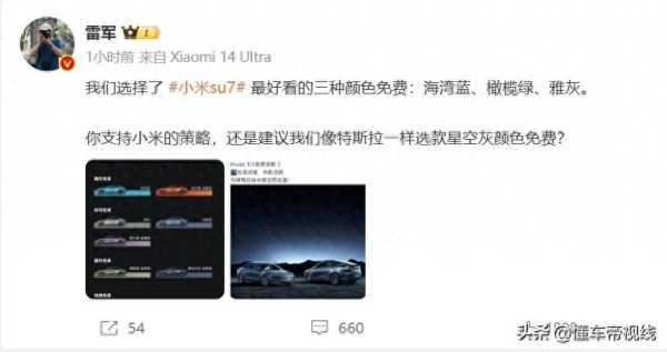 4月1日,特斯拉在官微上发布,原价1.2万的星空灰车漆,Model 3/Y可以免费选配。随即,雷军就发文称:“小米SU7我们选择了最好看的三种颜色免费:海湾蓝、橄榄绿、雅灰。你支持小米的策略,还是建议我们像特斯拉一样选款星空灰颜色免费? ”