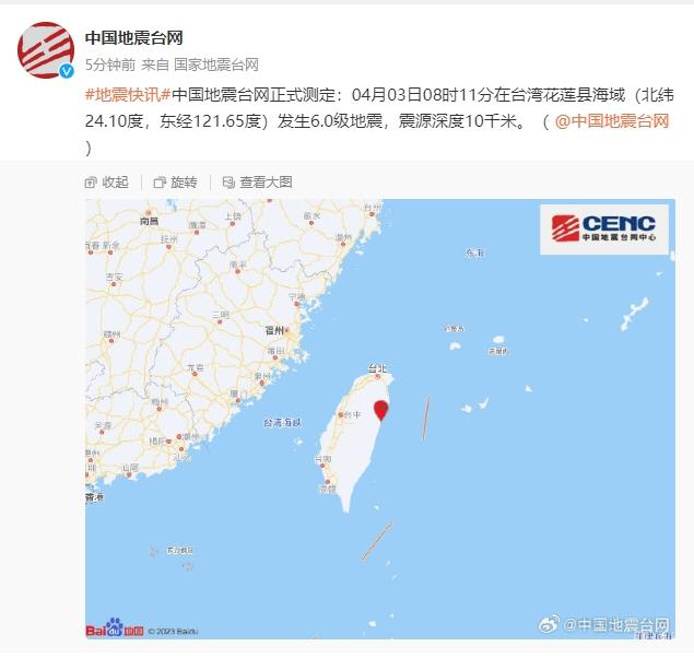 中国地震台网正式测定:04月03日08时11分在中国台湾花莲县海域(北纬24.10度,东经121.65度)发生6.0级地震,震源深度10千米。