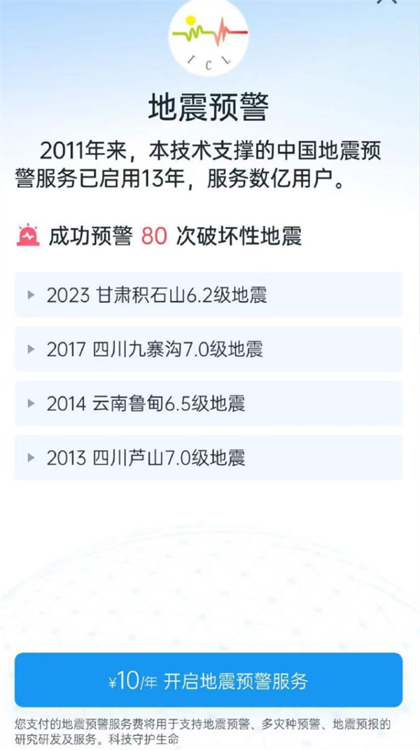 4月3日消息,近日,有网友爆料,因“跑赢地震波”被大家所熟悉的@成都高新减灾研究所 APP“地震预警”,开始向用户收取10元一年的订阅费。