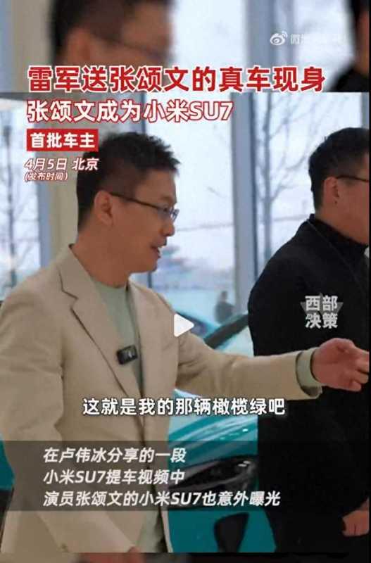 4月5日,在小米集团合伙人、总裁卢伟冰分享的一段小米SU7提车视频中,演员张颂文的小米SU7也意外曝光。