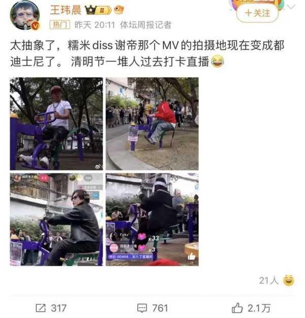 据悉,此地是说唱歌手诺米么diss谢帝歌曲MV的拍摄地,因歌曲中多次重复的“谢帝谢帝我要Diss你”发音和“谢帝谢帝我要迪士尼”相似被迅速传播,此地也被调侃是“成都迪士尼”。