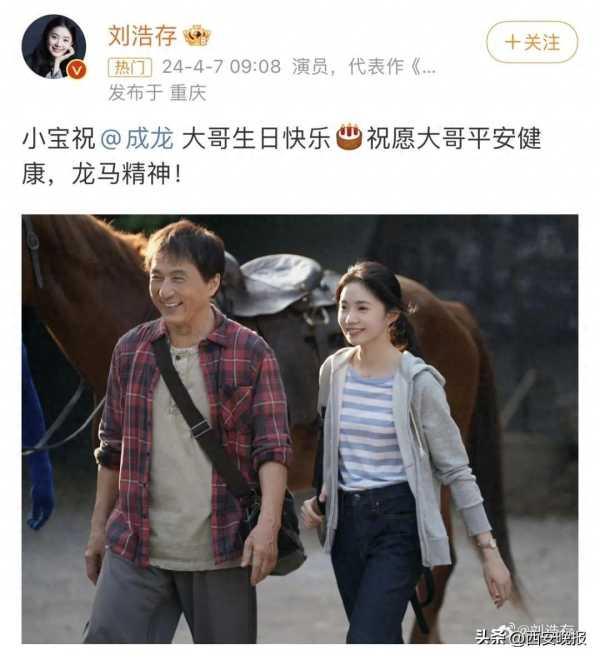 今天一早,曾在电影《龙马精神》中扮演成龙女儿“小宝”的演员刘浩存发文:“小宝祝成龙大哥生日快乐,祝愿大哥平安健康,龙马精神!”