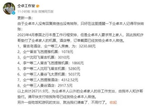 随后,工作室皮下发布新账单,称仝卓2023年4月的泰国行还欠工作人员两万余元家人出行费用。
