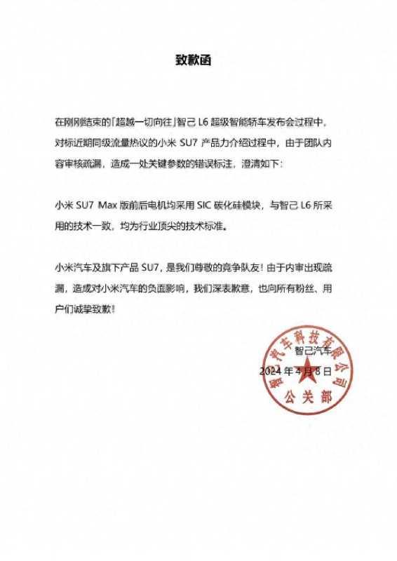 4月9日凌晨,智己汽车官方微博发布致歉函称,在刚刚结束的智己L6超级智能轿车发布会过程中,对标近期同级流量热议的小米SU7产品力介绍过程中,由于团队内容审核疏漏,造成一处关键参数的错误标注,智己汽车澄清:小米SU7 Max版前后电机均采用SIC碳化硅模块,与智己L6所采用的技术一致,均为行业顶尖的技术标准。该公司表示,“小米汽车及旗下产品SU7,是我们尊敬的竞争队友!由于内审出现疏漏,造成对小米汽车的负面影响,我们深表歉意,也向所有粉丝、用户们诚挚致歉!”