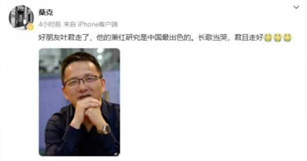 诗人桑克4月10日在社交媒体发文“好友叶君走了,他的萧红研究是中国最出色的。长歌当哭,君且走好。”