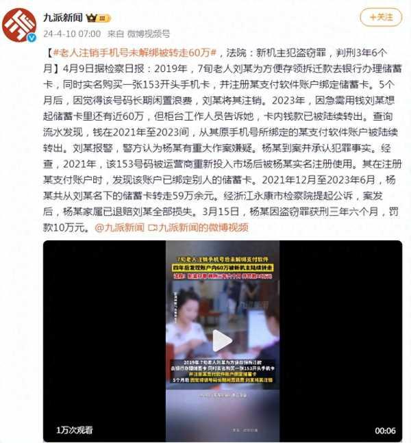 4月9日据检察日报:2019年,7旬老人刘某为方便存领拆迁款去银行办理储蓄卡,同时实名购买一张153开头手机卡,并注册某支付软件账户绑定储蓄卡。5个月后,因觉得该号码长期闲置浪费,刘某将其注销。2023年,因急需用钱刘某想起储蓄卡里还有近60万,但柜台工作人员告诉她,卡内钱款已被陆续转出。查询流水发现,钱在2021年至2023间,从其原手机号所绑定的某支付软件账户被陆续转出。