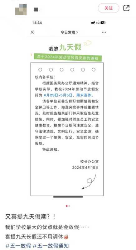 近日,江苏一高校多位学生发帖晒出学校发布的五一假期通知:从4月29日至5月5日放假,而且周末连休,这意味着可以休息九天,这引来其他高校学生的羡慕。该高校此前曾因能放假绝不调休而被网友称为“放假大学”。