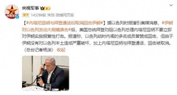 据@央视军事消息,据以色列时报援引美媒消息,伊朗对以色列发动大规模袭击后,美国总统拜登劝阻以色列总理内塔尼亚胡不要立即对伊朗实施报复性打击。报道称,以色列战时内阁的多名成员曾赞成回击,但由于伊朗没有对以色列本土造成严重破坏,加上内塔尼亚胡与拜登通话,回击被取消。(总台记者杨渊)