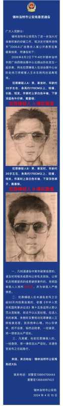 4月15日,锡林浩特市公安局发布通告称,对该市“2006.8.02”故意杀人案公开悬赏征集破案线索。2006年8月2日下午4时许,锡林浩特市南广场西侧会展中心北侧台阶处发生一起命案,两名犯罪嫌疑人持刀将被害人王永东刺死后逃离现场。凡知道破案线索的,请及时向公安机关报告,公安机关根据提供的线索破获案件的,将奖励举报人20万元。通告中还附有两名犯罪嫌疑人的模拟画像,两名犯罪嫌疑人当时均为20岁左右,没有姓名。(此前报道:悬赏20万!内蒙古警方通缉两命案逃犯,模拟画像公布)