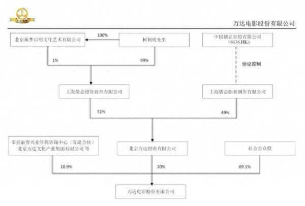 据公告,本次股权转让完成后,儒意投资持有万达投资51%股权,柯利明为儒意投资的实际控制人;同时柯利明先生通过其全资企业间接持有香港上市公司中国儒意控股有限公司(以下简称“中国儒意”)总股本16.34%的股份,中国儒意通过协议控制的上海儒意影视制作有限公司持有万达投资49%股权。因此,柯利明通过万达投资间接控制万达电影20%股权,为公司实际控制人。