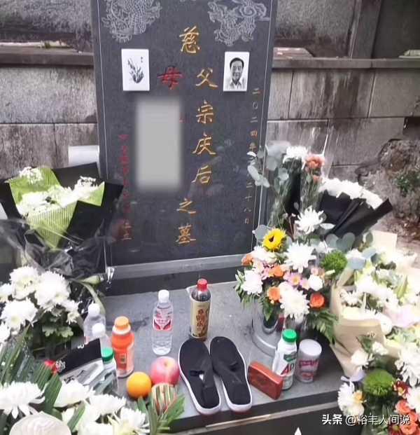 细看之下不难发现,墓碑上刻有两种颜色的字体,一个是父宗庆后,另外一个则是母,其他文字被遮挡。