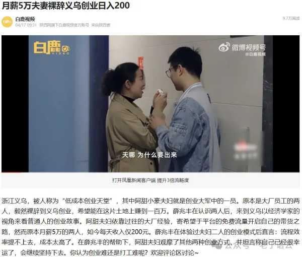 不妨先看看它大体都说了些什么。报道称,浙江义乌被称为“低成本创业天堂”,其中阿甜小豪夫妇就是创业大军中的一员。原本是大厂员工的两人毅然裸辞到义乌创业,希望能在这片土地上赚到一百万。依靠过往的大厂经验,小两口原本寄希望于平台的免费流量开启自己的带货之路,然而事与愿违的是,原本月薪5万的两人,如今每天收入仅200元。简单做个换算,日入200大约相当于月入6000,仅为原先5万月薪的1/8左右。