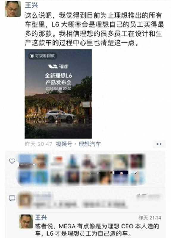 王兴在朋友圈表示:“这么说吧,我觉得到目前为止理想推出的所有车型里,L6 大概率会是理想自己的员工买得最多的那款。我相信理想的很多员工在设计和生产这款车的过程中心里也清楚这一点。”