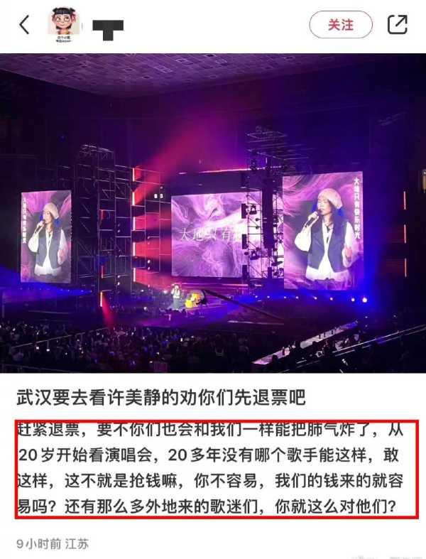 网友说这是许美静告别歌坛的演唱会,难道她不再演唱了,其实她很久就没有出现,感觉她自身的问题很多,曾经大闹酒店上了新闻,她真的可能不是一个健康的歌手,开演唱会也是需要体力和实力的,没有健康唱功劝退的歌手,就不要假借演唱会的名义圈钱了,观众也不是韭菜,想怎么割就怎么割。留点体面给大家,即使很穷,也不要欺骗大家,不要消耗最后一点好感。