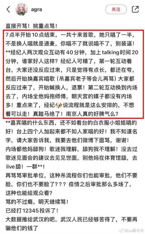 大量的时间是和观众交流,经纪人两次观众互动了40分钟,加上说话时间20分钟,一个小时没了。经纪人可能知道许美静不能唱,第一轮互动看台,大家不知道怎么一回事,只是觉得有点长,都在夸,然后换嘉宾唱歌,大家才反应过来,开始喊换人退票。第二轮互动换到内场去了,内场也是拖时间经纪人说流程就是这么安排的,不想看可以走,南京人的脾气真的很好。