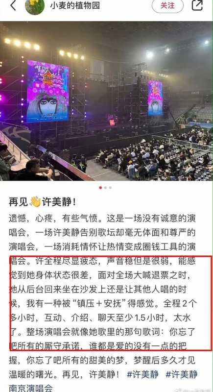 这是一场没有诚意的表演,一场许美静告别歌坛却毫无体面和尊严的演唱会,一场消耗情怀让热情变成圈钱工具的演唱会。