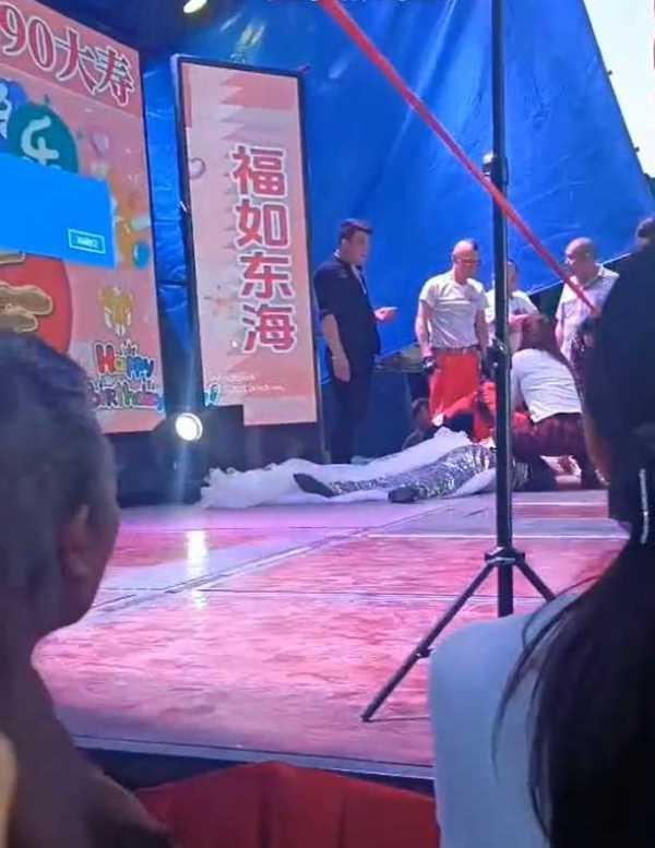 华商报大风新闻记者注意到,4月19日22:41,重庆当地一名网友发布祝寿演出现场的视频显示,一名身着演出服的女演员倒在台上,一名女子按压其胸部为其做心肺复苏,台上台下有多人围观,现场挂有“90大寿 福如东海”的祝福标牌。