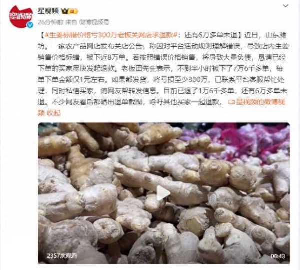 近日,山东潍坊。一家农产品网店发布关店公告,称因对平台活动规则理解错误,导致店内生姜销售价格标错,被下近8万单。若按照错误价格销售,将导致大量负债,恳请已经下单的买家尽快发起退款。老板田先生表示,不到半小时被下了7万6千多单,每单下单金额仅1元左右。如果都发货,将亏损至少300万,已联系平台客服帮忙处理,同时私信买家,请网友帮转发信息。目前已退了1万6千多单,还有6万多单未退。不少网友看后都晒出退单截图,呼吁其他买家一起退款。
