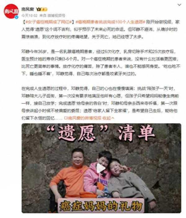 36岁的邓静2023年确诊为乳腺癌中晚期,她写下了100个人生遗愿清单,并拍下短视频,她表示,想给孩子留个念想。