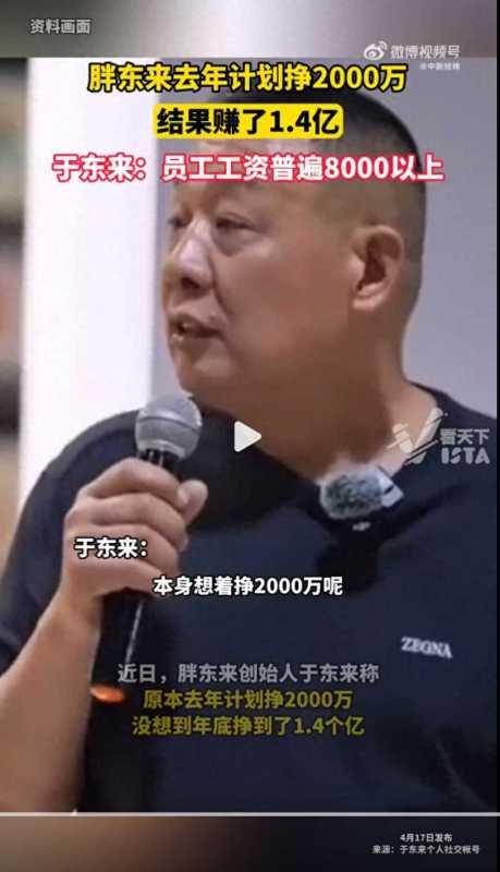 4月23日,话题#于东来称去年计划挣2000万元结果赚了1.4亿元#登上微博热搜。