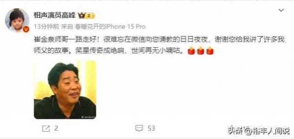 相声演员高峰于社交网上公开这一悲痛消息,并感谢他曾经为其讲述师父范振钰故事,两个关键词总结了崔金泉的一生:笑星传奇、小嘀咕。