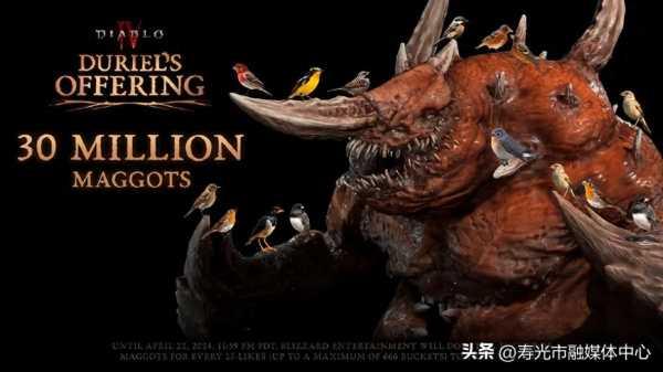 据了解,《暗黑破坏神》官推日前举办「蛆虫之王督瑞尔挑战活动」——官方推文每获得25个赞,暴雪就会捐赠内含45000只蛆虫的“爆汁大桶”。捐赠活动上限为666桶,约3000万只蛆虫,价值约1.3万美元。目前暴雪表示活动上限已经触发,3000万只蛆虫足以为医院救治的鸟类提供两年的食物,粉丝们还可以放心,这些蛆虫能够储存起来不会被浪费。“督瑞尔的献祭已完成。蛆虫之王知道自己的幼虫已经在地球日上得到了善用,因此感到安心。”