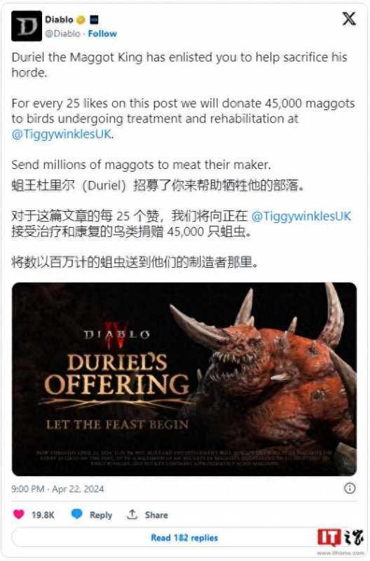 这看似奇怪的举动其实与暴雪旗下知名游戏《暗黑破坏神》有关。游戏中,督瑞尔 (Duriel) 是蛆虫之王,而他的最新任务则是“消灭自己的小弟们”。暴雪别出心裁地将这一设定融入到环保活动中,承诺暗黑破坏神地球日帖子每获得 25 个点赞,就向 Tiggywinkles 捐赠一桶蛆虫(约 4.5 万只)。捐赠上限为 666 桶,总计约 3000 万只蛆虫。