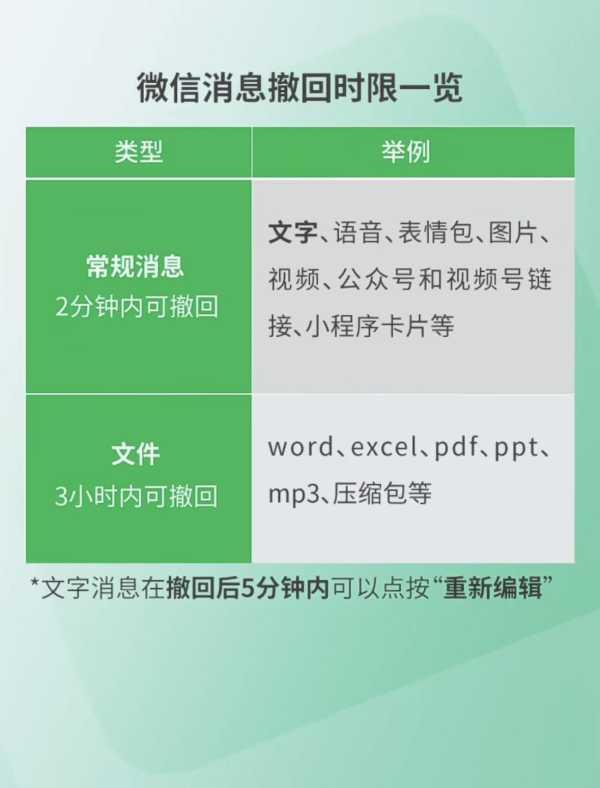 IT之家从官方新闻稿中获悉,包括文字、语音、图片、表情包、视频公众号、视频号链接、小程序内容均可在 2 分钟内撤回,其中文字消息可以在撤回 5 分钟内重新编辑,避免大家重新打字;包含 Word、Excel、PDF、PPT、MP3、压缩包等文件三小时内可以撤回。