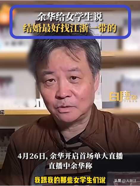 4月26日,余华开启人生中第一次单人直播,他提到,女学生结婚要找江浙男,因为江浙男人会做饭,会做家务,没有大男子主义。