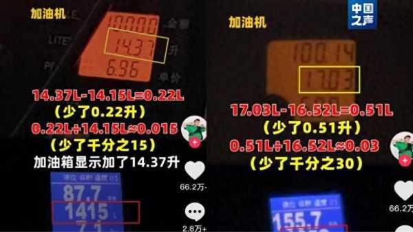 △该博主与专业调查机构合作,发现永城市和虞城县的两家加油站“缺斤少两”。(图片来源 该博主社交平台视频截图)