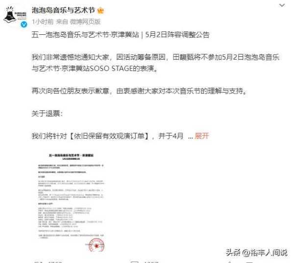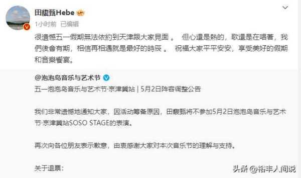 首先便是天津音乐节的官方账号官宣调整公告,并向田馥甄的粉丝表示,如果想退款,可以按照正常流程进行,如果不想退款,那么也可以继续欣赏其他歌手的精彩表演。