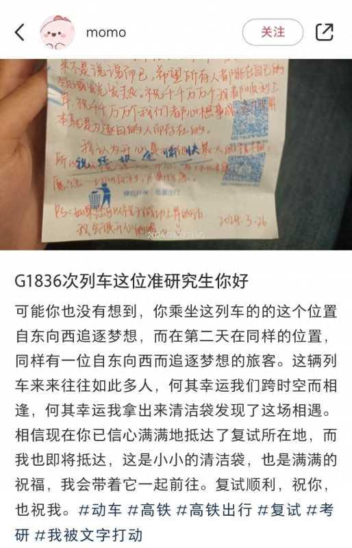 3月27日,小红书网友“momo”发布了一条名为“G1836次列车的这位准研究生你好”的帖子,帖中附上了一张写满红色字迹的清洁袋。