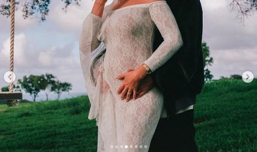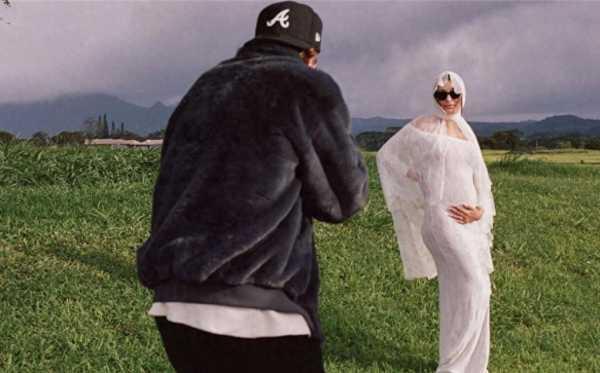 贾斯汀分享的照片中,海莉身穿宛如结婚礼服的蕾丝白色长裙,戴着墨镜,手捧孕肚。贾斯汀则化身护花使者,或拿着相机为妻子拍摄美照,或站在妻子身后,用双手守护她和肚子里的孩子,看起来幸福满满。