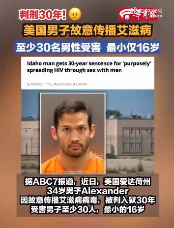 据ABC7报道,近日,美国爱达荷州,34岁男子Alexander因故意传播艾滋病病毒,被判入狱30年。