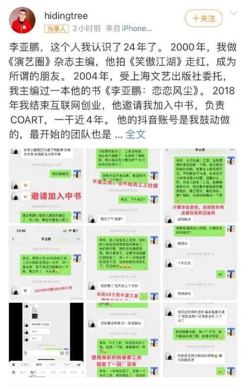 #曝李亚鹏拖欠员工工资#13日,网友晒与李亚鹏聊天记录,曝其拖欠员工工资、社保、业务费等长达10个月,“只要涉及钱,选择性失明。”该网友表示与李亚鹏认识了24年,李亚鹏因《笑傲江湖》走红时,俩人成为“朋友”。