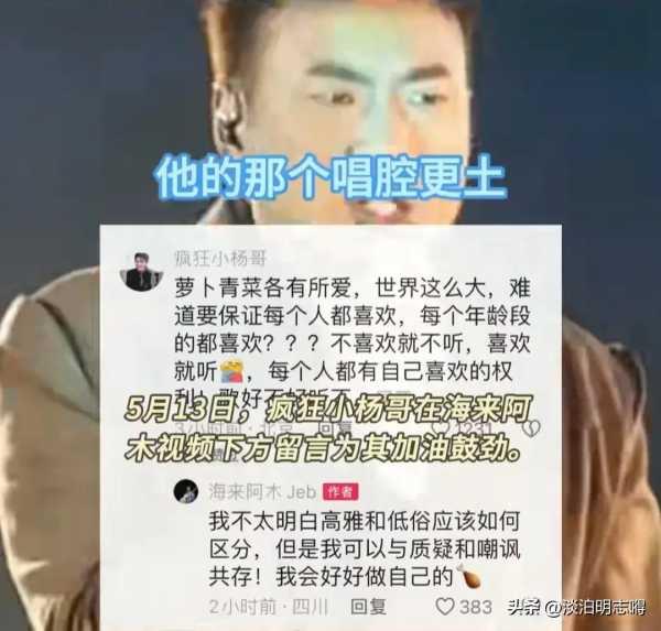 面对这波舆情,抖音一哥疯狂小杨哥在海来阿木视频评论区公开力挺,表示萝卜青菜,各有所爱,喜欢就听,不喜欢就不听,每个人都有喜欢的权利,但是说人家土就不对了,他的努力和为梦想奋斗的心大家都是能看得到的,并且鼓励阿木提升自己,变得更强大,阿木也是回应了小杨哥的暖心评论,直言会做好自己。