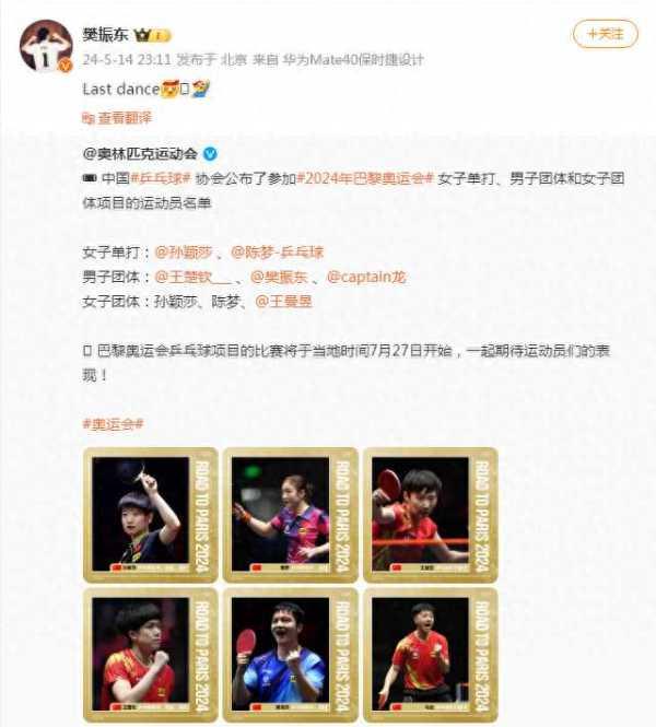 5月14日晚,樊振东转发了奥运会官方微博上关于参加巴黎奥运会的中国乒乓球运动员名单的文章并配文:Last dance(最后一舞)。