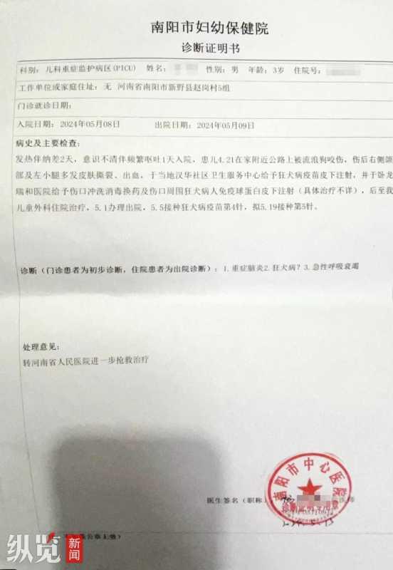 纵览新闻记者在樊女士提供的诊断证明书看到,南阳市中心医院·南阳市妇幼保健院为小星做出的诊断为:1.重症脑炎;2.狂犬病;3.急性呼吸衰竭。但第二项狂犬病处标有一问号。5月14日,纵览新闻记者拨打了南阳市中心医院的电话,工作人员称,病情属于个人隐私,不方便透露。