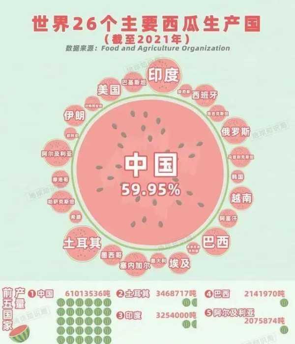根据国际粮农组织2021年的统计数据,中国从西瓜产量来看,占绝对统治地位,是第二名土耳其的17.6倍,占全球前5名产量的85.4%,占全球26个主要西瓜生产国产量的73.6%。