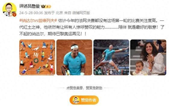 著名评述员詹俊对比赛做出点评:估计今年的法网决赛都没有这场第一轮的比赛关注度高。一代红土之神,他依然有让所有人惊呼赞叹的能力…………..陪伴 就是最好的敬意!了不起的纳达尔,期待巴黎奥运再见!!